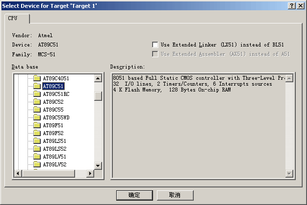 (2)选择所要的单片机,这里我们选择常用的Ateml公司的AT89C51。此时屏幕如图1-4所示。AT89C51有什么功能、特点呢?不用急,看图中右边有简单的介绍,稍后的章节会作较详细的介绍。完成上面步骤后,我们就可以进行程序的编写了。 (3)首先我们要在项目中创建新的程序文件或加入旧程序文件。如果你没有现成的程序,那么就要新建一个程序文件。在KEIL中有一些程序的Demo,在这里我们还是以一个C程序为例介绍如何新建一个C程序和如何加到您的第一个项目中吧。点击图1-5中1的新建文件的快捷按钮,在2中出现一个新的文字编辑窗口,这个操作也可以通过菜单File-New或快捷键Ctrl+N来实现。好了,现在可以编写程序了,光标已出现在文本编辑窗口中,等待我们的输入了。第一程序嘛,写个简单明了的吧。下面是经典的一段程序,呵,如果你看过别的程序书也许也有类似的程序: