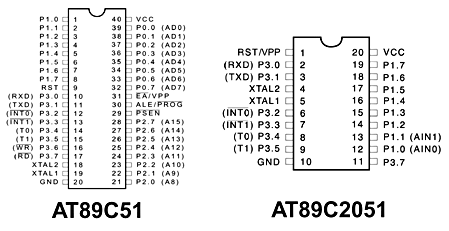 图2-1中是AT89C51和AT89C2051的引脚功能图。而表2-1中则是它们的主要性能表。以上可以看出它们是大体相同的,由于AT89C2051的IO线很少,导致它无法外加RAM和程序ROM,片内Flash存储器也少,但它的体积比AT89C51小很多,以后大家可根据实际需要来选用。它们各有其特点但其核心是一样的,下面就来看看AT89C51的引脚具体功能。 1.电源引脚 Vcc 40 电源端 GND 20 接地端 *工作电压为5V,另有AT89LV51工作电压则是2.7-6V, 引脚功能一样。