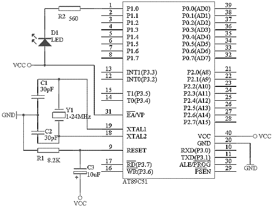 XTAL1 19 XTAL2 18 XTAL1是片内振荡器的反相放大器输入端,XTAL2则是输出端,使用外部振荡器时,外部振荡信号应直接加到XTAL1,而XTAL2悬空。内部方式时,时钟发生器对振荡脉冲二分频,如晶振为12MHz,时钟频率就为6MHz。晶振的频率可以在1MHz-24MHz内选择。电容取30PF左右。 *型号同样为AT89C51的芯片,在其后面还有频率编号,有12,16,20,24MHz可选。大家在购买和选用时要注意了。如AT89C51 24PC就是最高振荡频率为24MHz,40P6封装的普通商用芯片。